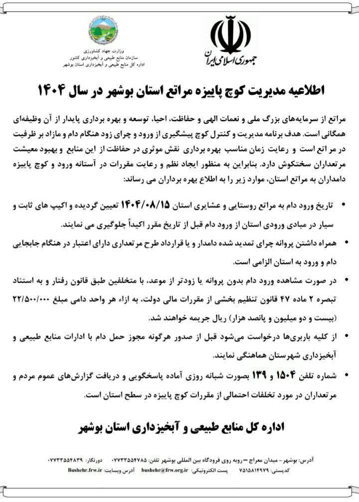 اطلاعیه مدیریت کوچ پائیزه مراتع استان بوشهر در سال 1404 (7-7-1404)